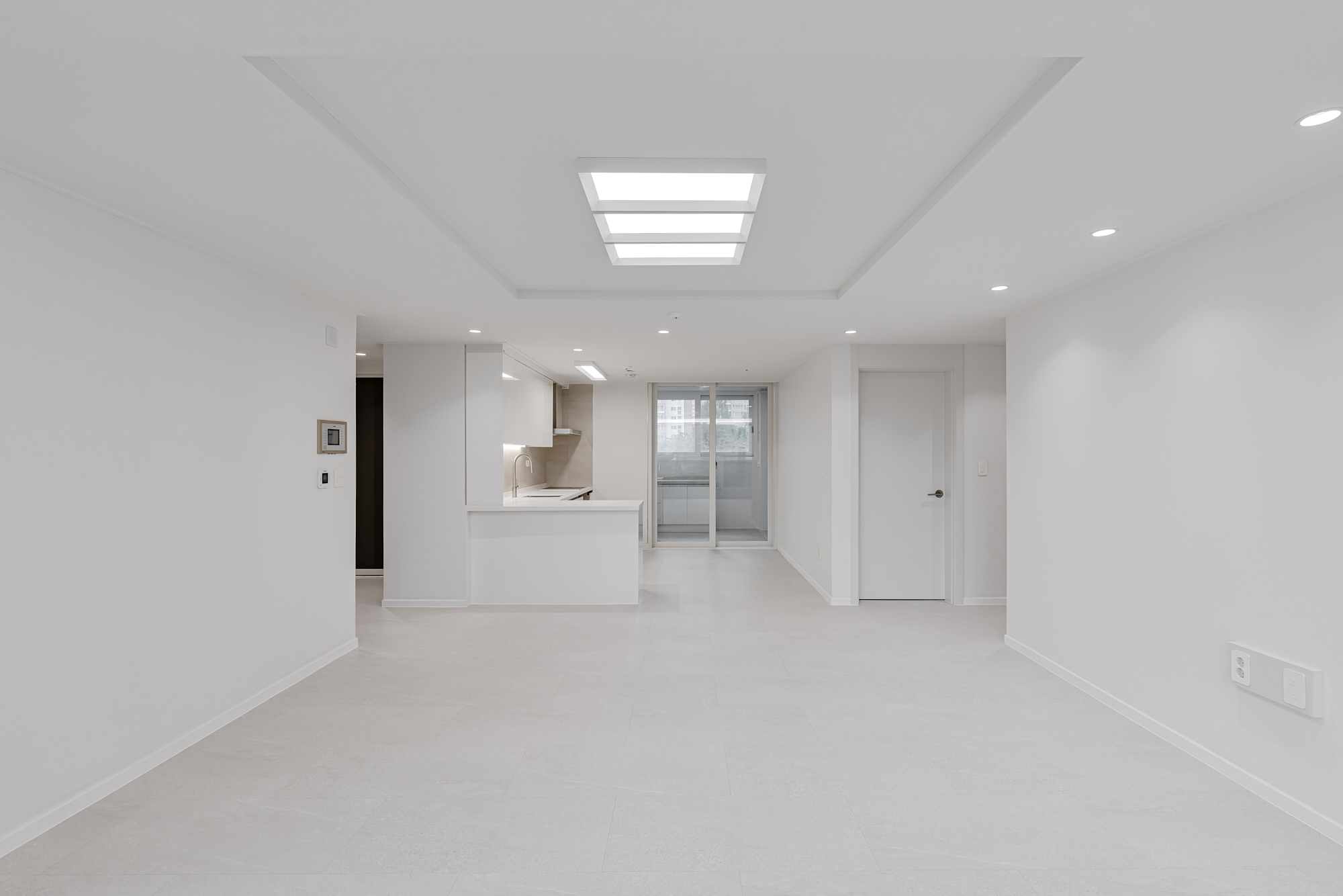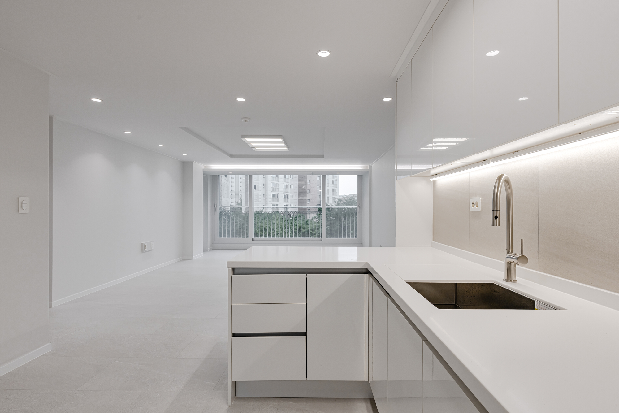 사이버 공간으로 느껴질 만큼 화이트톤으로 단순하게 눌렀다. 바닥은 LX 하우시스 최신 제품 바닥 타일 에디톤이다.