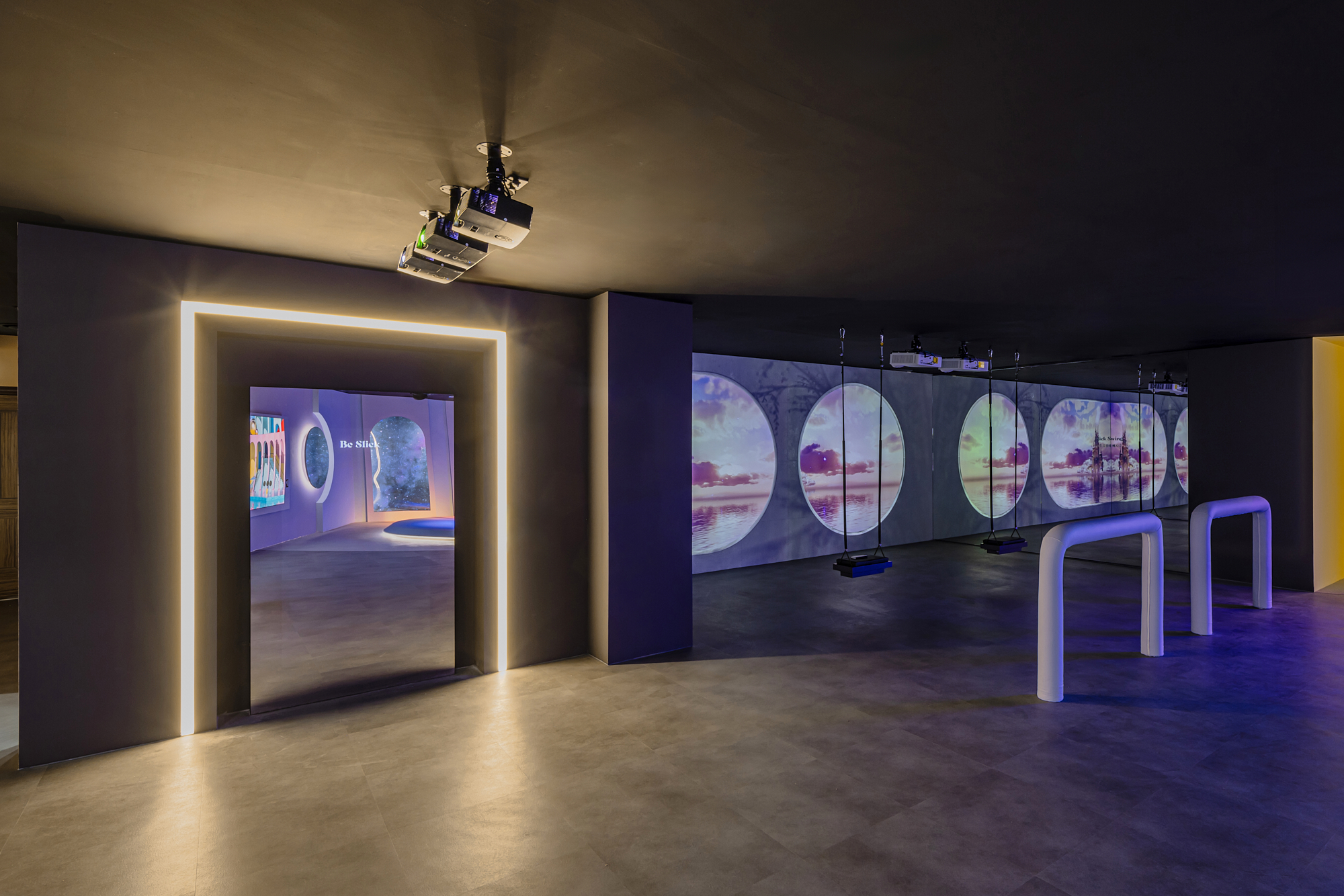 원하는 이미지를 와이트 광각 스크린에 투영시켜 미디어아트를 체험하는 공간.