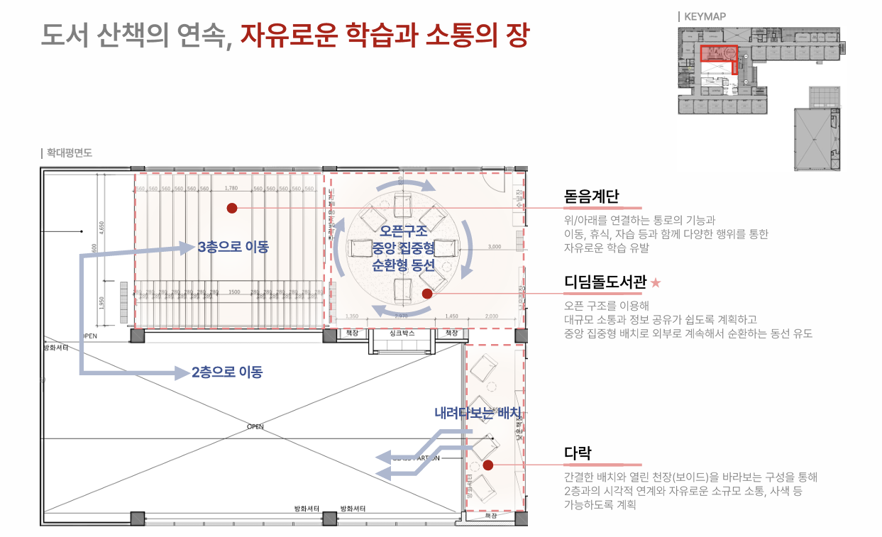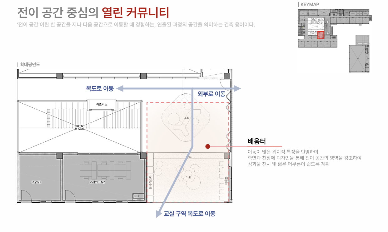 학교 측이 바라는 공간의 목적 및 다양한 기능들을 수용하고, 학생들의 입장에서 공간을 배려하며, 디자이너의 입장에서는 다양한 연출의 시도와 공간에 대한 고민을 지속적으로 하고, 사업주의 측면에서 공사비나 공사 일정 등을 고려하면서