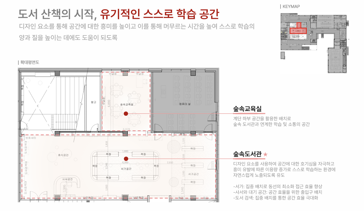 "학습의 교재가 되는 공간"이라는 문구를 잡고, 다양한 관점에서 풀어나가기 위해서 고민했다.