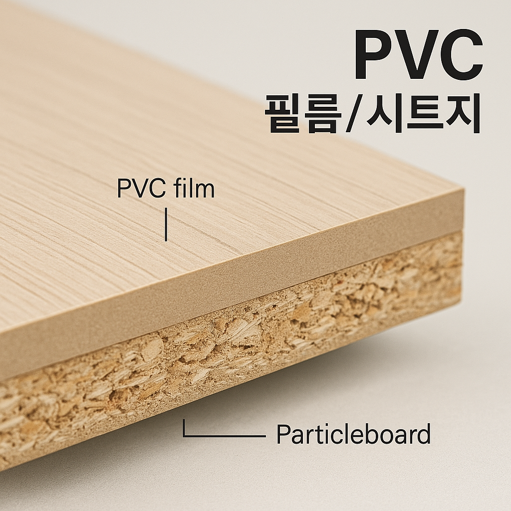 색상과 질감, 광택 표현이 다양하며, 시공이 비교적 간편합니다. 다만 열과 습기에 장기간 노출될 경우 필름이 들뜨거나 박리될 수 있는 단점이 있습니다.